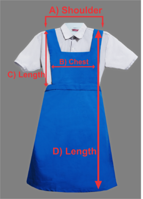 | Size | (A) Waist | (B) Shoulder to Waist | (C) Shoulder | (D) Waist to Hem | (E) Hem Width |